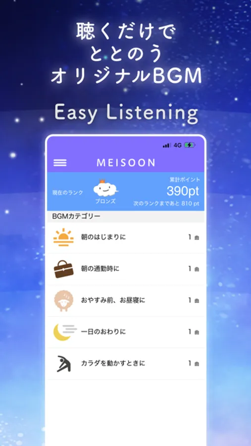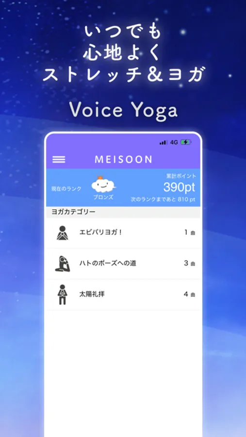 MEISOONは、瞑想の他、音声による太陽礼拝のヨガの誘導や、通勤時や就寝時など自然と気持ちが落ち着いてくるオリジナル音源のBGMも用意しております。好きなタイミングでヨガやBGMをお楽しみください。 ■MEISOONの主な機能