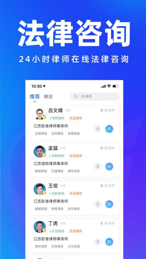 您生活中的法律助手,查看附近律师,免费法律咨询,涵盖离婚纠纷、劳动仲裁、交通事故、遗产继承、债权债务、侵权赔偿、房产纠纷、知识产权等领域,精准为您匹配专业律师;大牌律师帮你处理律师函、代写文书、合同审查、法律顾问、打官司,解决你的深层法律需求。
