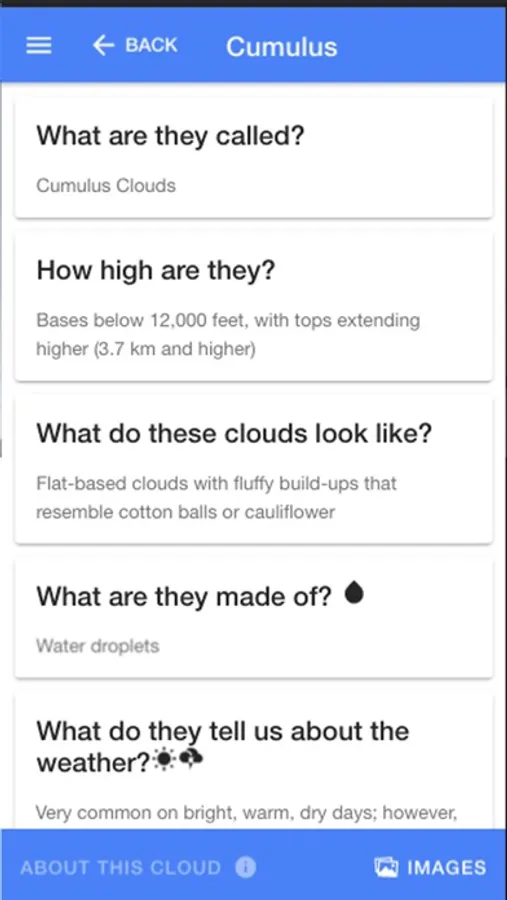 The UCAR Center for Science Education's Field Guide to Clouds is a portable guidebook to identifying clouds. Learn about the different clouds in the sky, including how they form, how they get their names, and what they can tell you about the weather. Test your cloud knowledge with quizzes. Available with English and Spanish text.