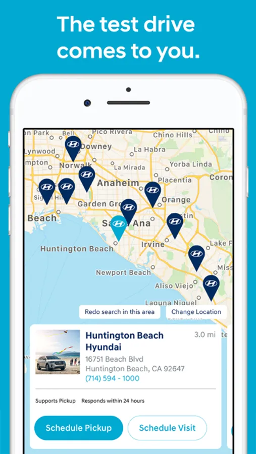 - In certain areas you can Schedule a Pick Up. Elect a time and place where you want to test drive a Hyundai and we’ll come to you. Please keep an eye on Schedule a Pick Up vs. Schedule a Visit. We are always adding new locations for Pick Up.