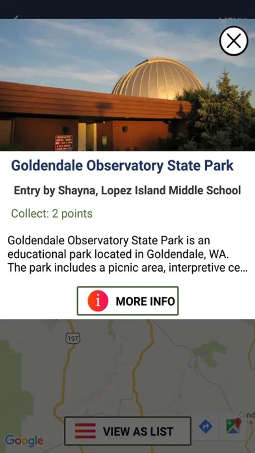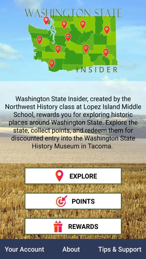 The Explore button takes you to the map of Washington, which has pins indicating places of interest where you can collect points. Clicking on each pin on the map gives you more information about that location.
