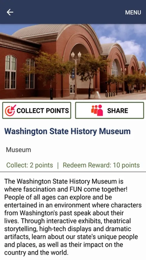 Once you collect enough points, those points can be redeem them for discounted entry into the Washington State History Museum in Tacoma. Hitting the “Redeem Rewards” button while physically at a Rewards location will bring up a key pad for the place owner to enter a code to deduct points from your point total in exchange for your reward. You must have an internet connection in order to redeem points.