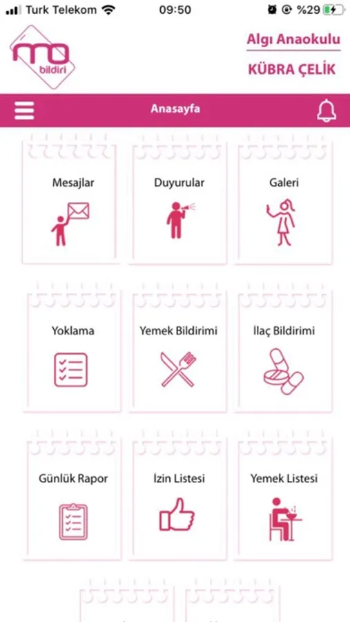 Çocuklarının sağlık durumları takibinde ilaç bilgisi ve veriliş saat, dozaj bilgisini okul öncesi kuruma online yollayabilmektedir. ilaç verildiğinde veliye ilaç verildiğine dair bilgi mesajıyla gelmektedir.