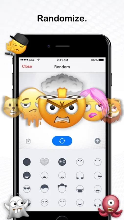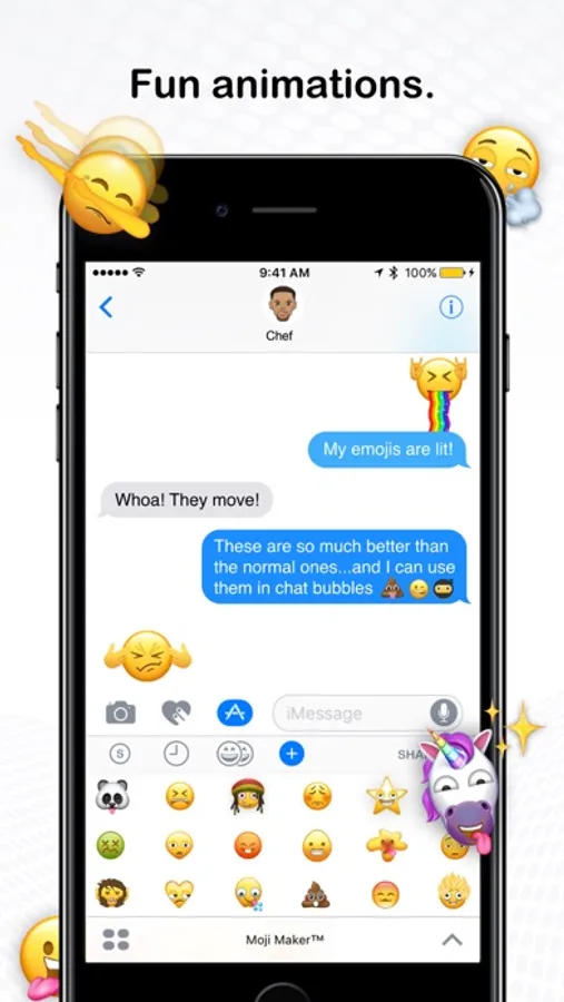 Moji Maker emojis now display in iMessage the same as the standard Unicode emoji. Best of all we’ve added hundreds of animated parts to bring your emojis to life! Use the Random feature to quickly create hilarious emojis automatically.