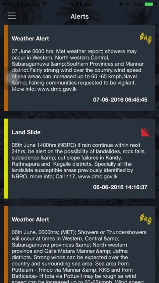- Alerts: receive alerts directly released by DMC of Sri Lanka based on your location and threat level (i.e. if an alert is national everyone will receive the message as opposed to a regional alert)