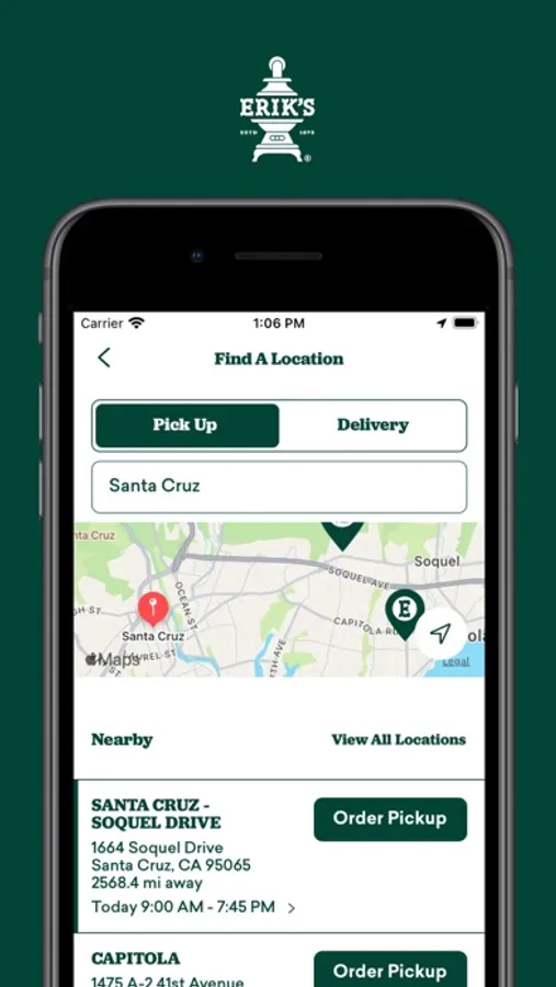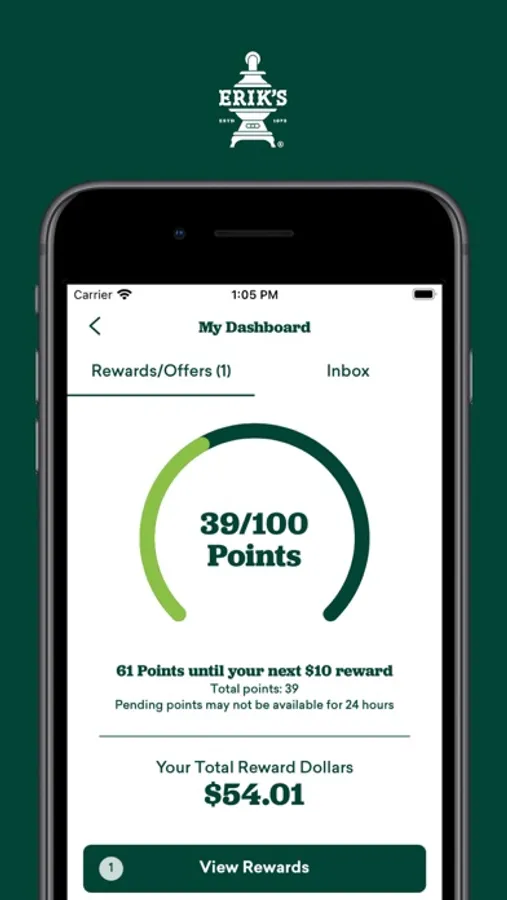 Order online through the app and earn loyalty points with every purchase; scan the QR code at the register with your smartphone or scan the bar code on the receipt to earn Loyalty Points instantly. For every dollar you spend, you’ll get 1 Loyalty Point; earn 100 Loyalty Points and receive a $10 reward to spend on your next visit at Erik's!