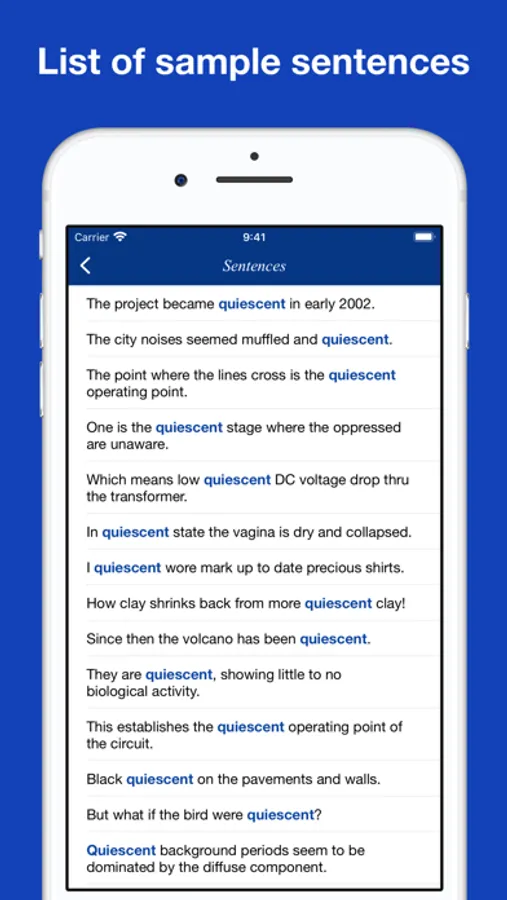 - It is more efficient to learn a word in its context. In addition to a list of example sentence, the app provides a tool to look for sample usage from the news. You will easily remember its meaning and know how to use it in a sentence.
