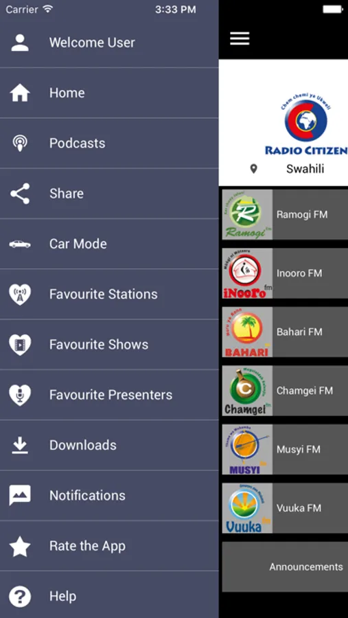 With Citizen Radio app, you can listen to Radio Citizen, Hot 96 FM, Ramogi FM, Inooro FM, Egesa FM, Mulembe FM, Bahari FM, Sulwe FM, Chamgei FM, Wimwaro FM, Musyi FM, Muuga FM and Vuuka FM.