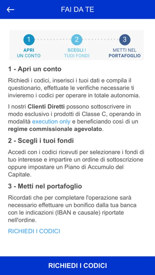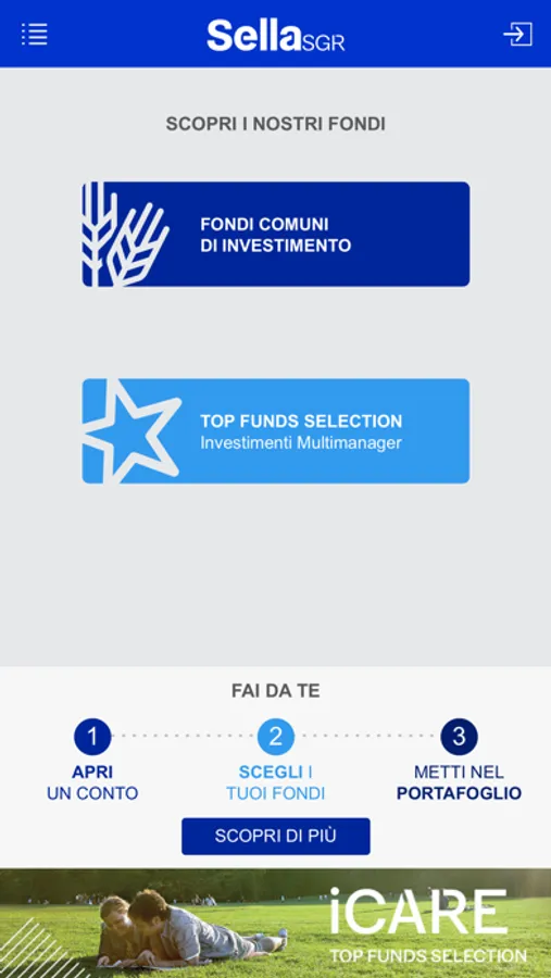 L’applicazione è dedicata ai prodotti di Sella SGR che possono essere acquistati direttamente dall’utente finale senza necessità di intermediari (Execution Only).