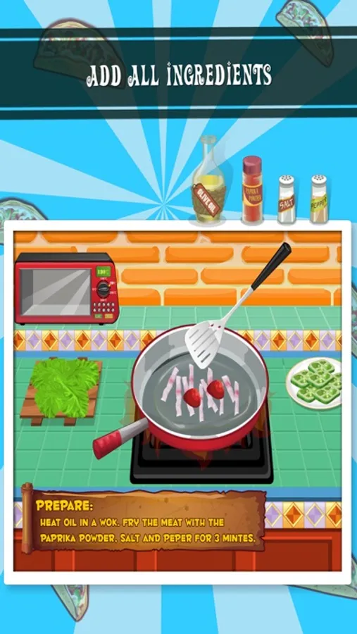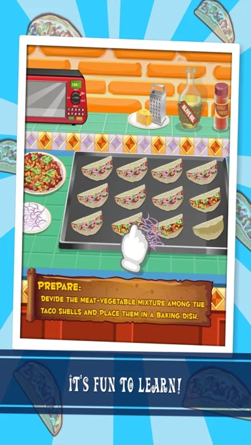 Today we're going to prepare some Mexican food! Play this cooking game and learn step by step how to prepare tasty tacos. Cut the vegetables and the meat, and preheat the oven. If you follow the in-game instructions, you'll manage to prepare this Mexican dish perfectly well! After you've played the game, the end page offers you the possibility to see the actual recipe.