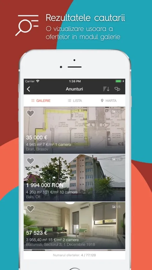 - Trei moduri de prezentare a rezultatelor căutarii: listă, galerie și hartă