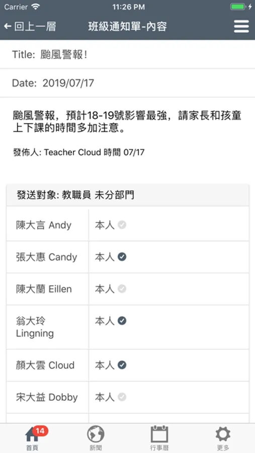 2. 班級通知單:接收班級教師或學校發送的訊息。