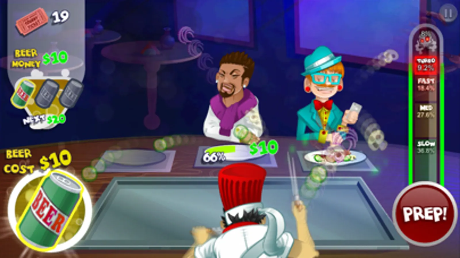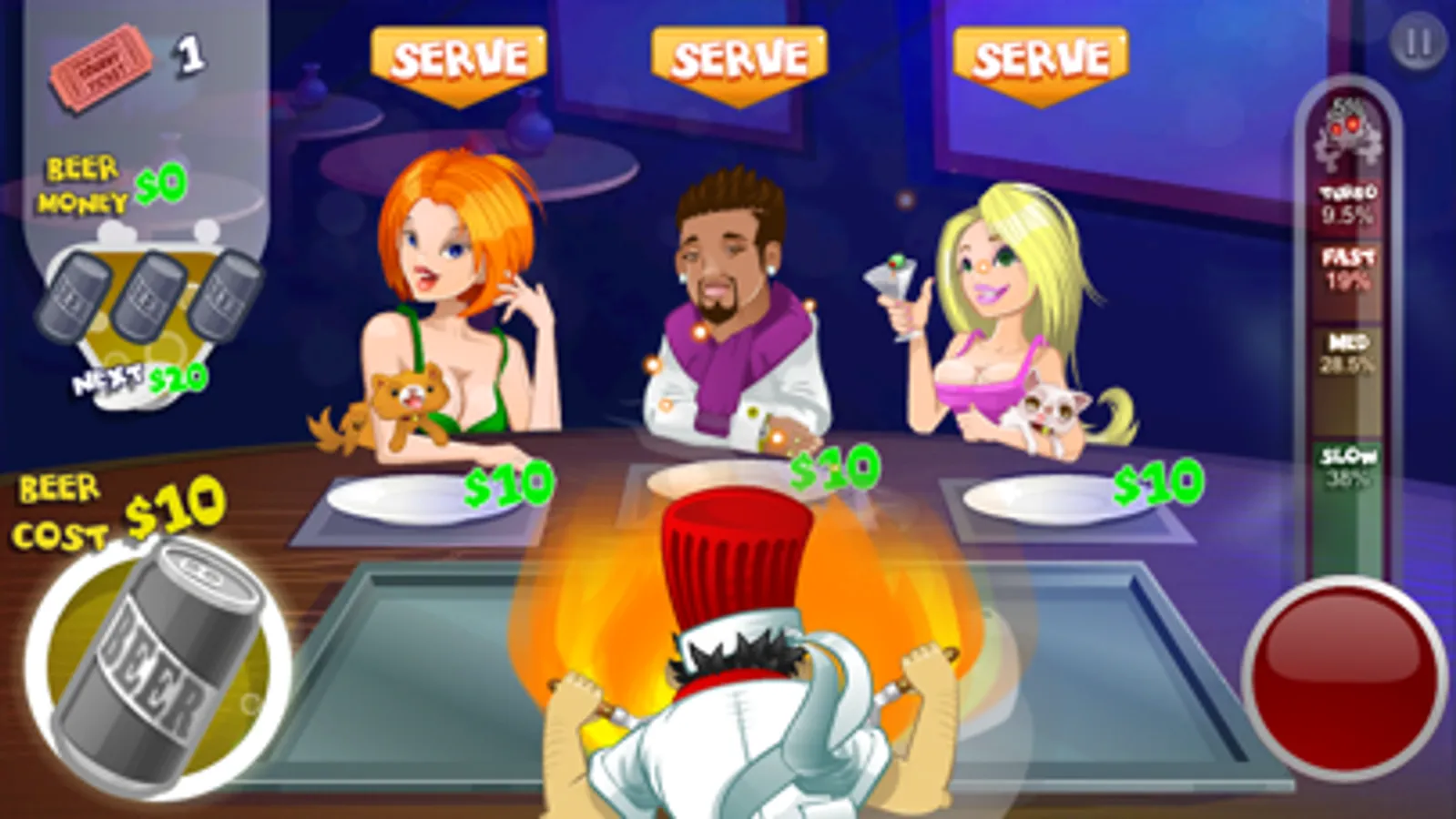 As you cook for customers you earn cash. Spend your cash on BEER and get wasted while violently flinging SHARP KNIVES and lighting HUGE FIRES just inches away from your dinner guests. Serve customers to earn TOURNAMENT TICKETS.