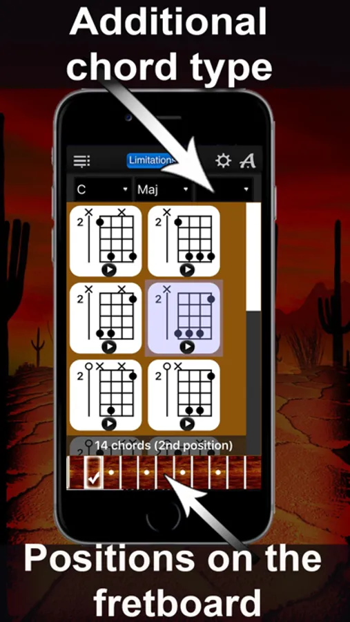 Thanks to a specially developed algorithm, the app will show you chord diagrams with all possible options in all 11 positions of the fretboard. Simply select a chord root on the left, chord type in the middle, the chord type addition on the right, and explore the chords with “Banjo Chords Compass Lite”!