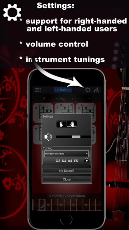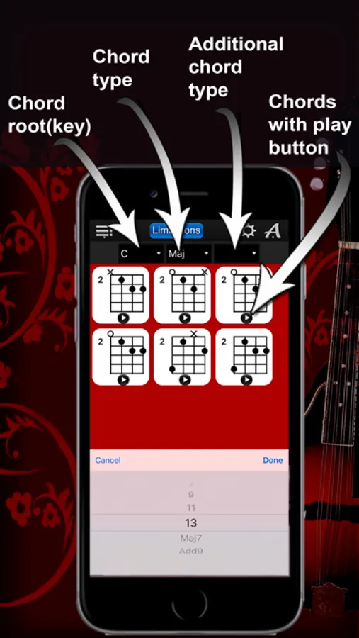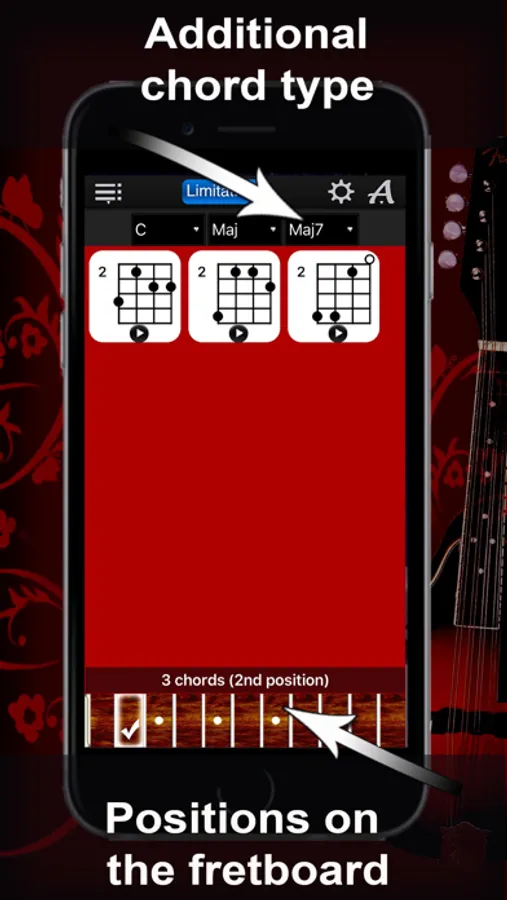 Thanks to a specially developed algorithm, the app will show you chord diagrams with all possible options in all 11 positions of the mandolin fretboard. Simply select a chord root on the left, chord type in the middle, the chord type addition on the right, and explore the chords with “Mandolin Chords Compass Lite”!