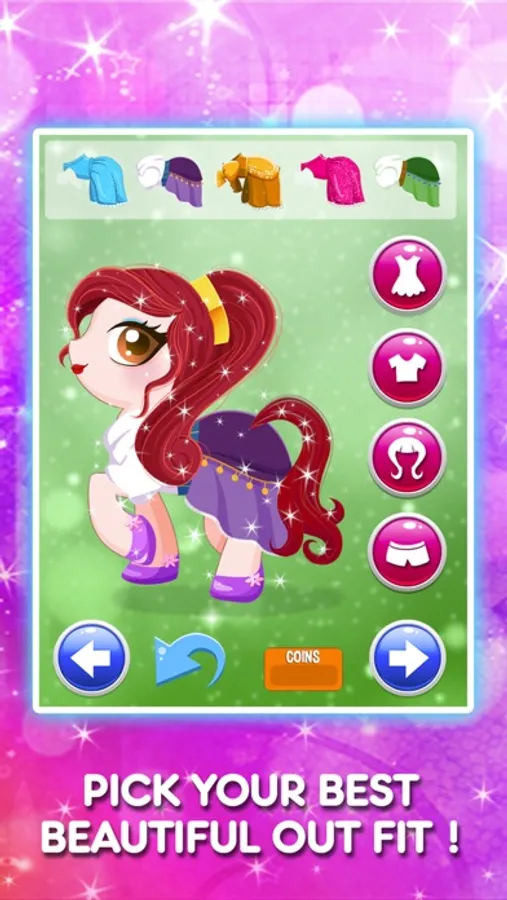 You can customize your pony's hair, head accessory, shades, necklace, dress, anklet or shoes. Additional extras are luxurious backgrounds that will introduce a totally new context to your pony's gorgeous environment.
