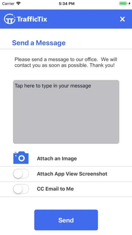 TrafficTix also provides clients with the capability to message Gannes & Musico front office directly from within the app and send camera and photo gallery images and app screenshots as email attachments.