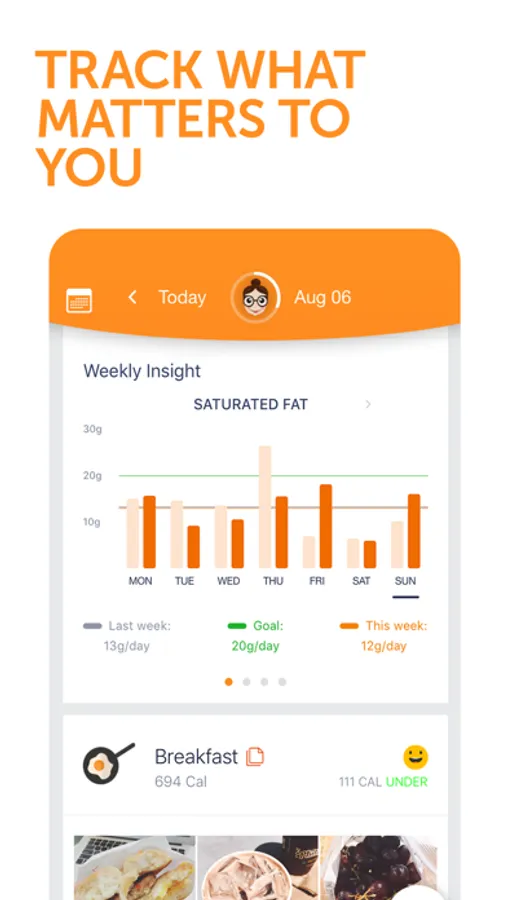 Automatically log additional nutrients such as carbs, fat, protein, cholesterol, fiber, vitamin C, vitamin A, iron, and sodium.