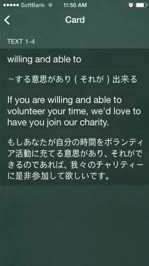 This flashcard app will help Japanese learners master general English. It teaches the most common collocations of English in the form of phrases. Included are over 3,000 phrases taken from the app English Master 10,000, each with an example sentence, with each phrase and sentence translated into Japanese. A 13 member research team took over 3 years to create these contents. Only items which half or more of the phrase are said in a different way than the English were selected. Thus, students can concentrate on only items which are difficult to learn.