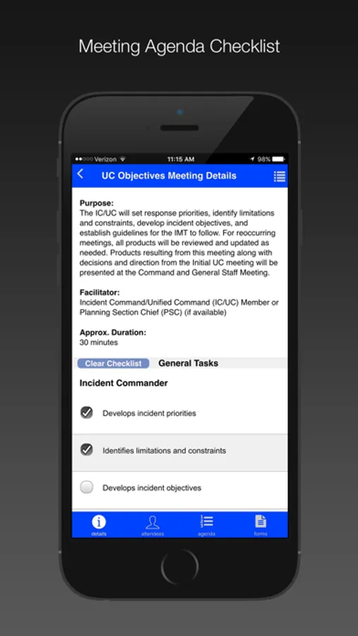 • Meeting details pages with checklists for tasks, attendees, agendas as well as a listing of ICS forms normally used during those meetings.