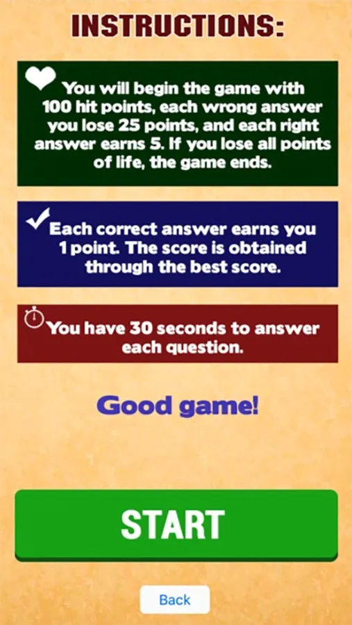 You will begin the game with 100 hit points, each wrong answer you lose 25 points, and each right answer earns 5. If you lose all life points, the game ends.