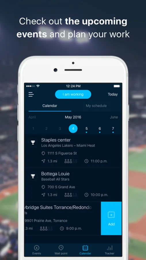 View the list of upcoming music and sports events for the next 3 months, add the most interesting of them to your schedule and get alerts when it’s time to drive there and pick up riders who head home.