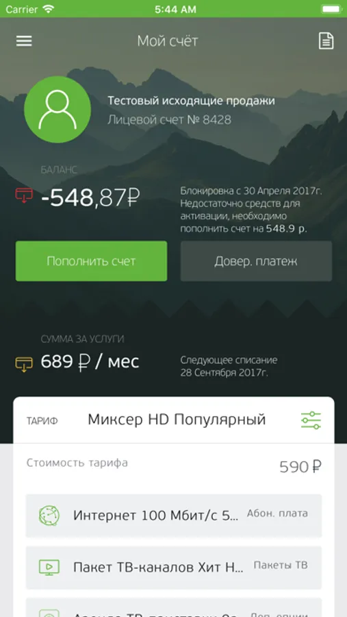 Состояние вашего счета, остаток средств и суммы для пополнения в режиме онлайн.