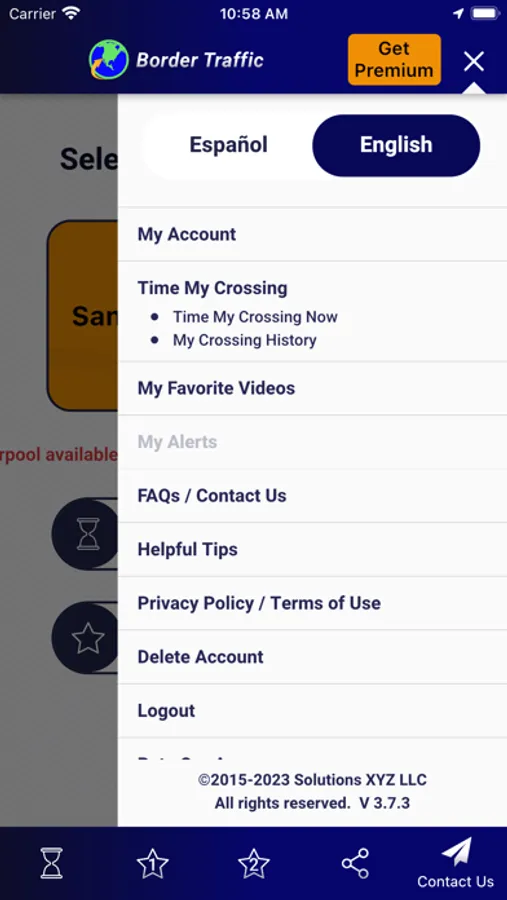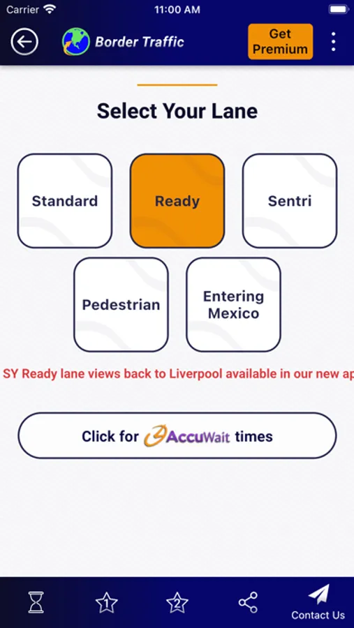 • My Alerts notify you when the wait time meets criteria you’ve set. For example, you may set an alert to notify you when the wait in the San Ysidro Ready Lane is less than 20 minutes.