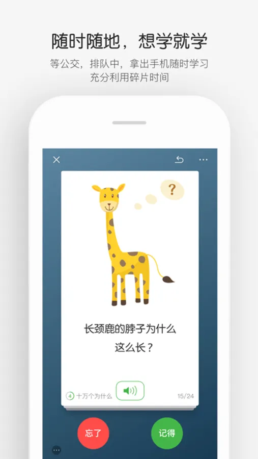 卡片式学习,可充分利用碎片化时间学习,排队的时候、等电梯的时候,还有坐车无聊的时候。随时拿出手机学习巩固。