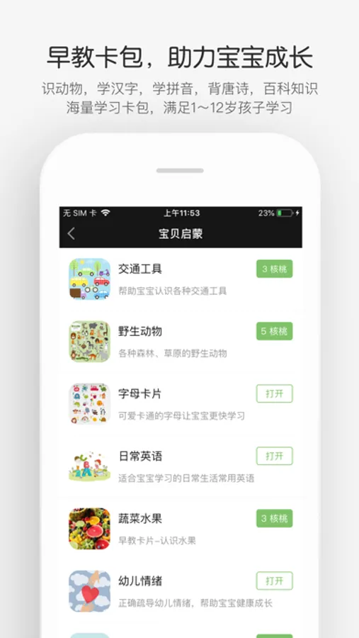 针对3~12岁儿童,我们提供了丰富的学习卡包。有学唐诗,认汉字,学拼音,百科知识,不同场景下的英语学习等等。