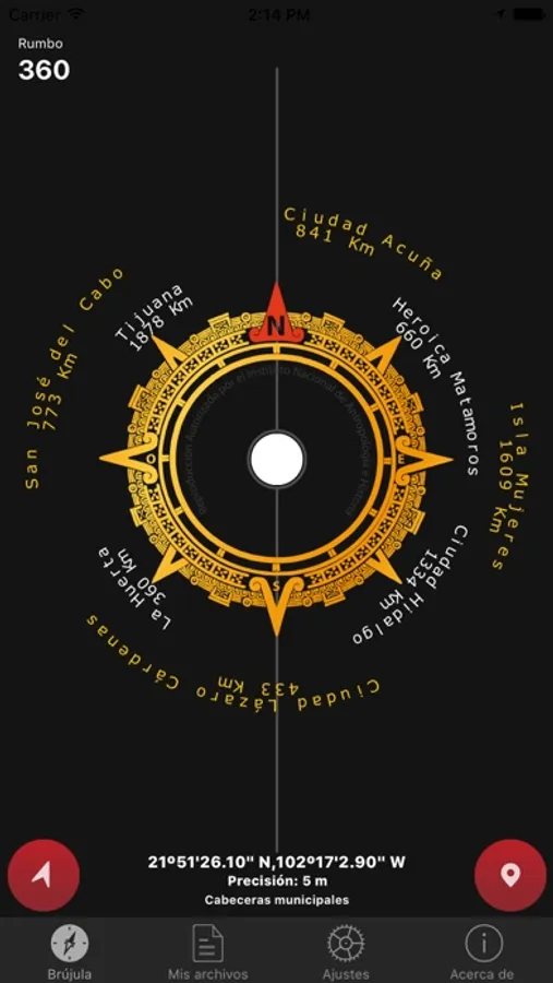 - Sobre los puntos cardinales despliega el nombre de algunas ciudades de México y la distancia lineal a partir de la ubicación