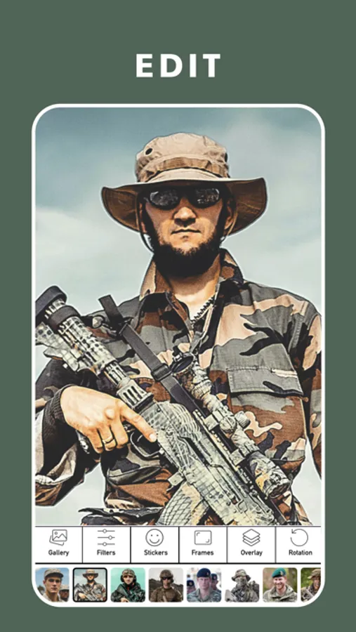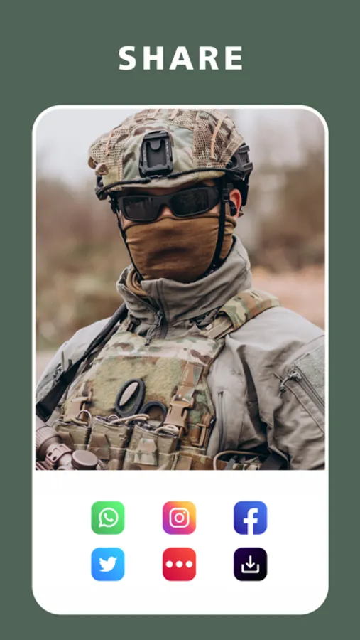 “Military Photo Montage” maker app and have the best photo fun in our life. This is a fantastic army game for boys that will amaze you and leave you speechless. Dare to enter this fun photo booth and use the photo stickers with different parts of military uniform. Get all the necessary equipment and prepare tor the battle!