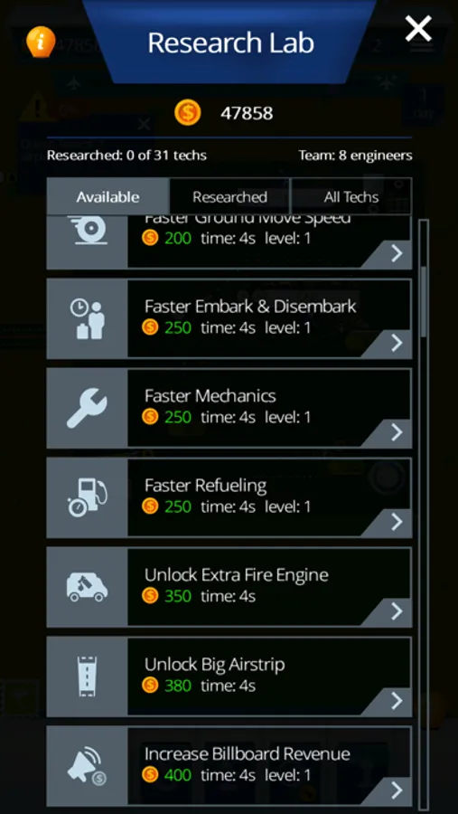 • Research: Use the research lab to unlock VIP airplanes, such as pop stars, military jets and presidential planes (Air Force One)