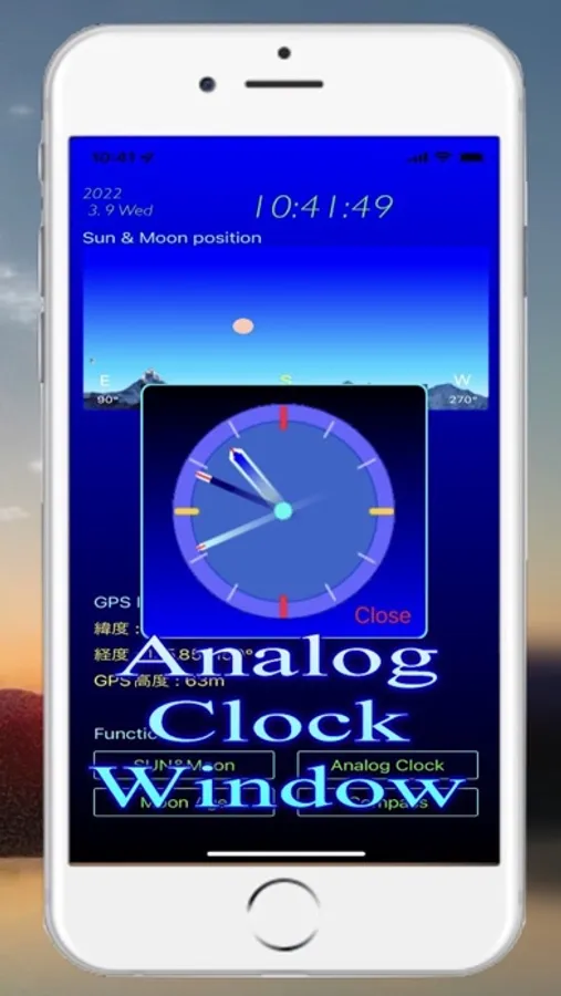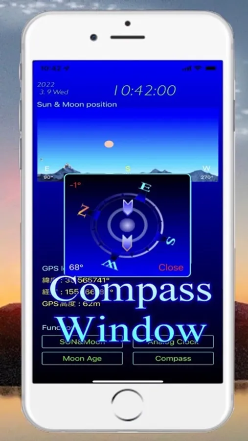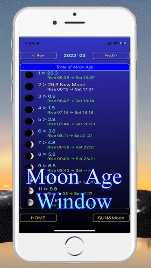 日の出、日の入り、月齢をiPhone内蔵のGPSを使って計算し表形式で表示するアプリです。