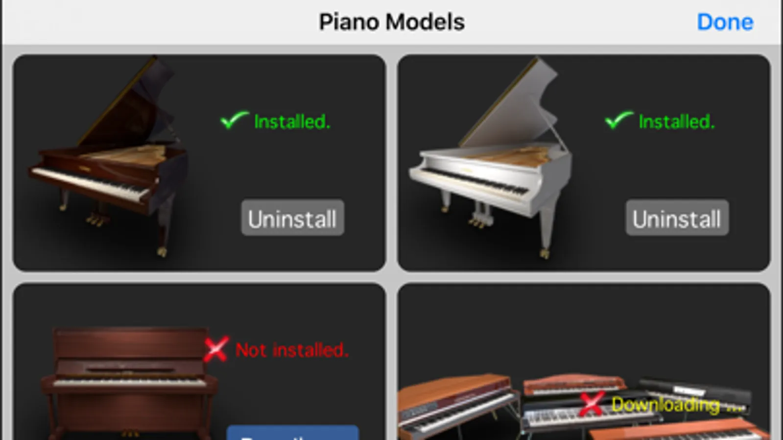 Colossus Piano sets a new standard in terms of realism, detail and overall quality of piano sounds on your iPad, iPhone and iPod touch. There are 8 acoustic piano models available as 8 individual in-app purchases, plus 5 E-Piano legends bundled as 1 sound set with this app, together those 13 piano models make up 30 Gigabyte of sound material. All keys of all piano models were recorded in full length with a recording quality of 24 bit and 96 kHz stereo.