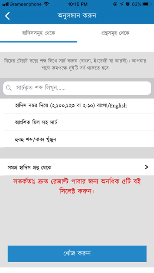 You can search the hadith and other Islamic books in Bangla / English / Arabic words or phrase.