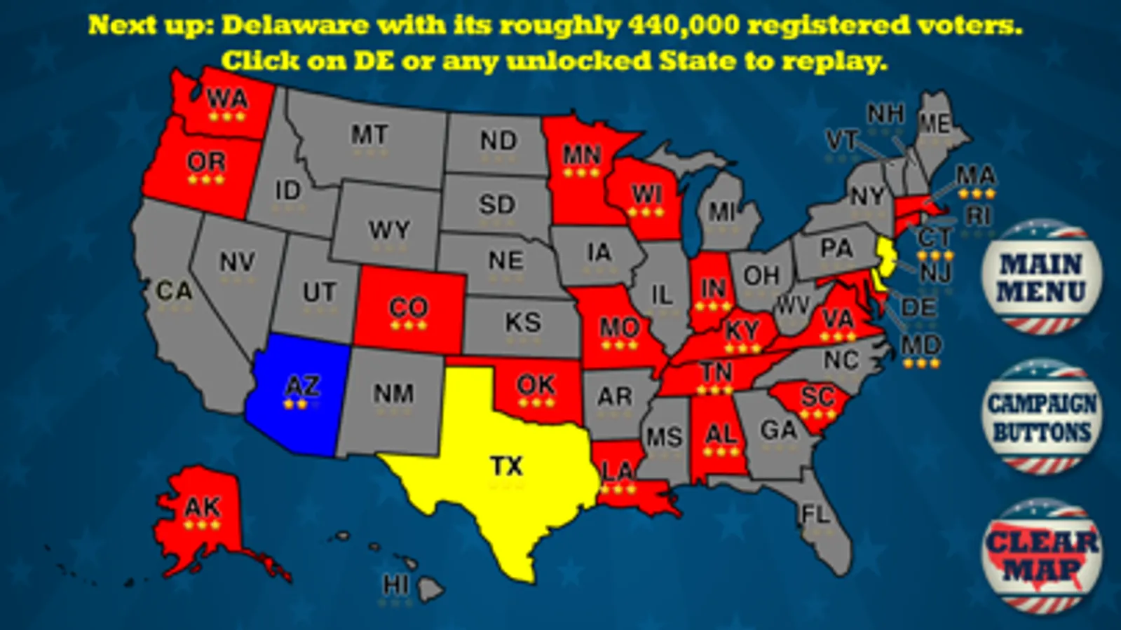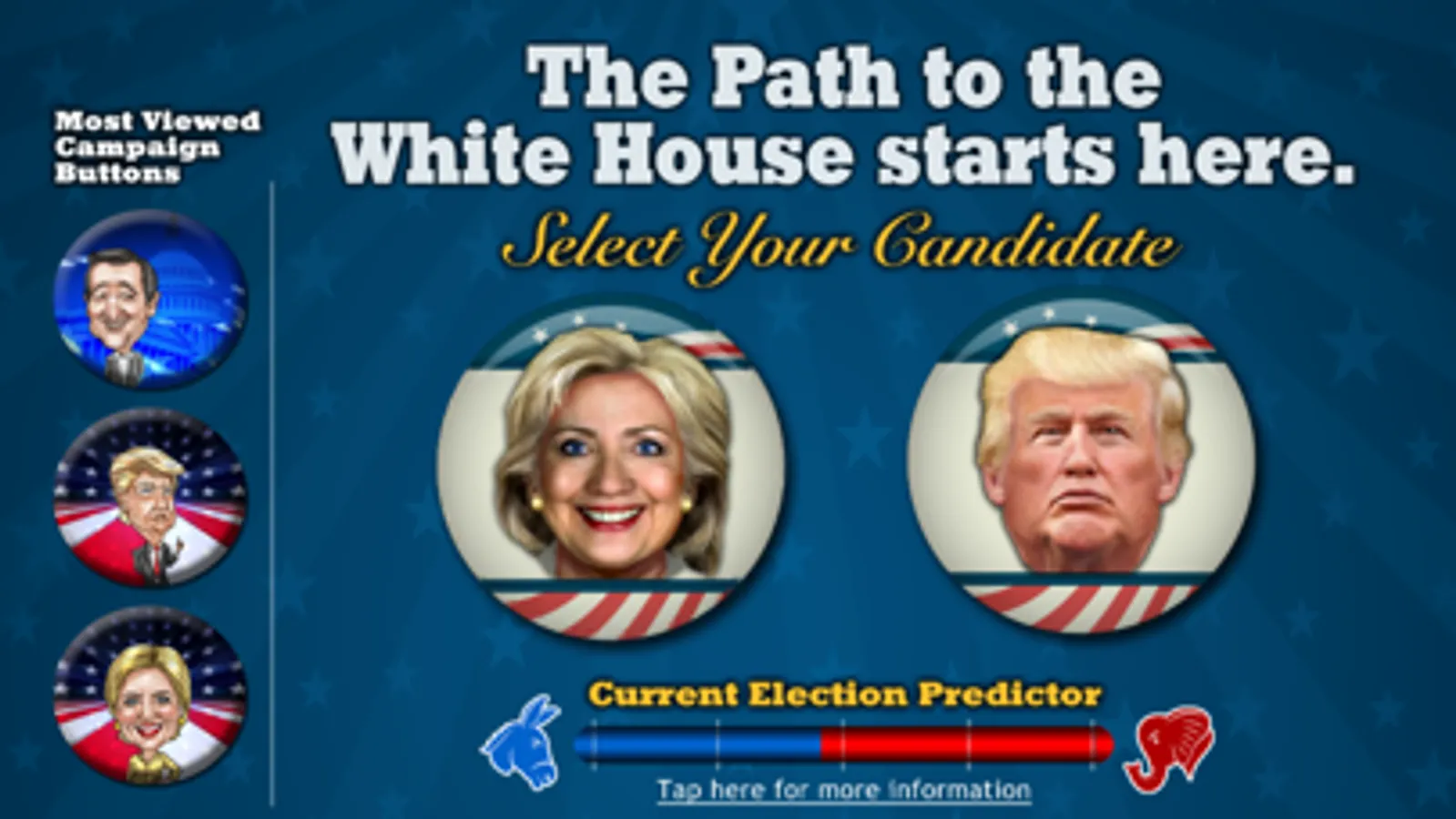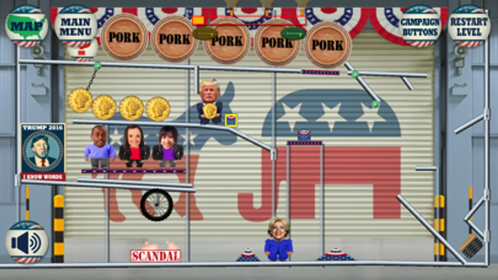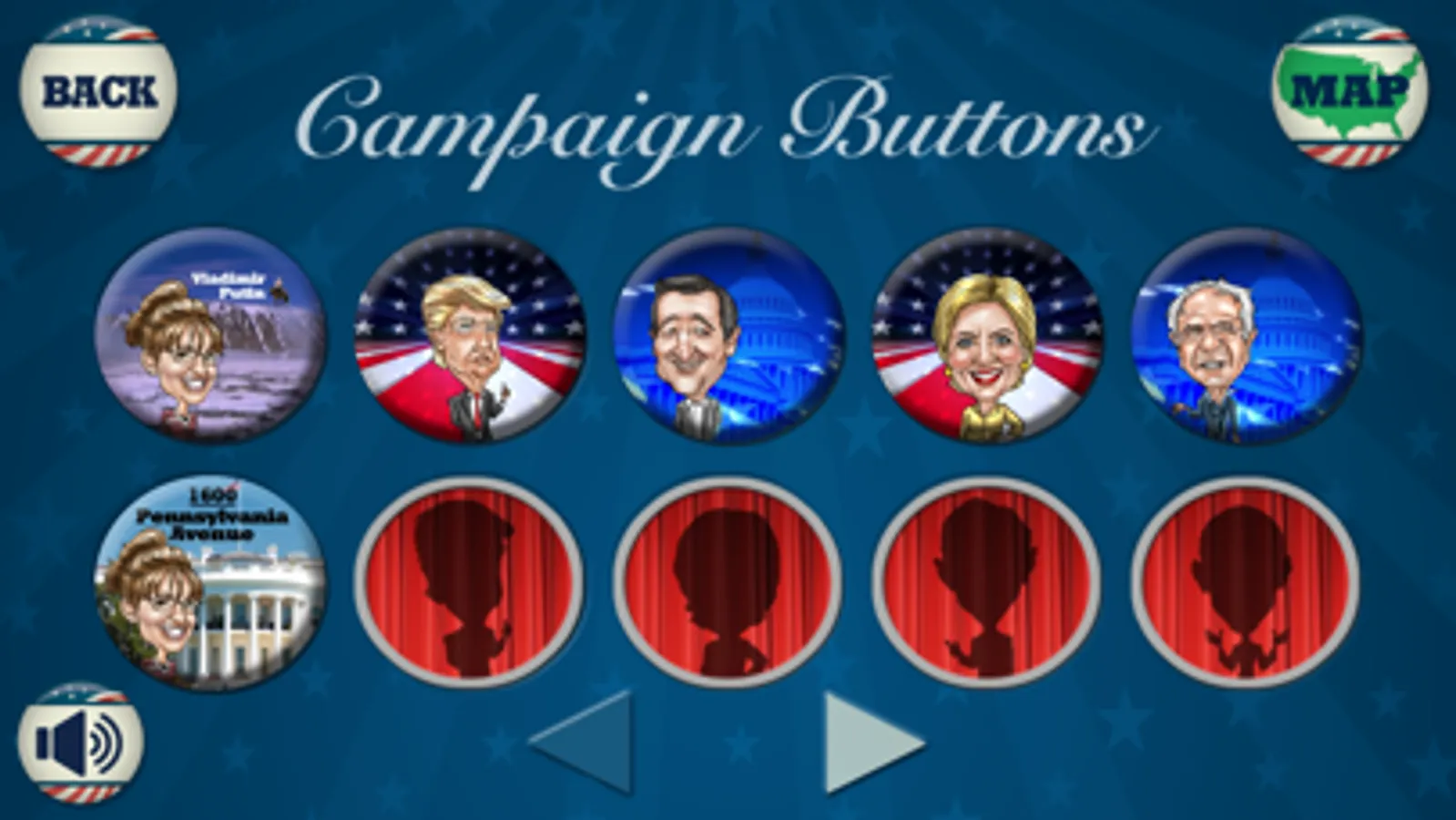 Along the way, avoid scandals, grab campaign contributions and collect Campaign Buttons, animated bloopers featuring a hall of fame of political figures, including Trump, Hillary, Sarah Palin, Ted Cruz, Bernie Sanders, VP Joe Biden, Pres Obama, Mitt Romney and Pres George W. Earn 3 stars on every state to sweep the nation and propel your candidate to victory.