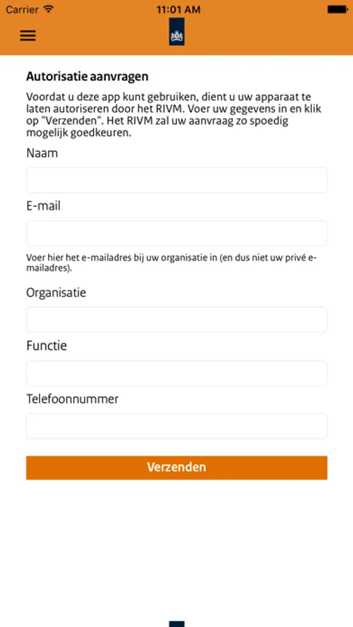 De app is in principe bedoeld voor AGS, GAGS en landelijke ketenpartners en is niet voor iedereen toegankelijk. Voordat u toegang krijgt dient u (nadat u de app heeft gedownload) eenmalig toestemming te vragen. Dat kan via de knop autorisatie. U dient daar enkele gegevens te noteren en te verzenden. U ontvangt een e-mail ter bevestiging dat u toegang wilt. Op basis van toelatingscriteria wordt al dan niet toegang tot de app verleend. Wij gaan daarbij uit van een doelgroep vastgesteld door: RIVM-MOD, vakgroep IBGS, ketenpartners IBGS , GAGS-platform, CET-md en CETs.