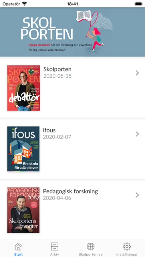 Skolporten är ett oberoende populärvetenskapligt magasin med fokus på forskning och utveckling i förskolan och skolan. Skolporten går på djupet i ett aktuellt tema i varje nummer, med forskning som grund. Magasinet innehåller också reportage, artiklar och krönikor samt inte minst den senaste utbildningsvetenskapliga forskningen. Ambitionen är att knyta samman forskar- och skolvärlden i syfte att stärka skolans vetenskapliga grund.