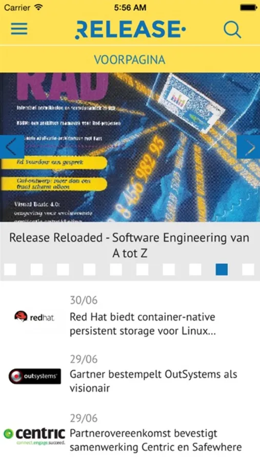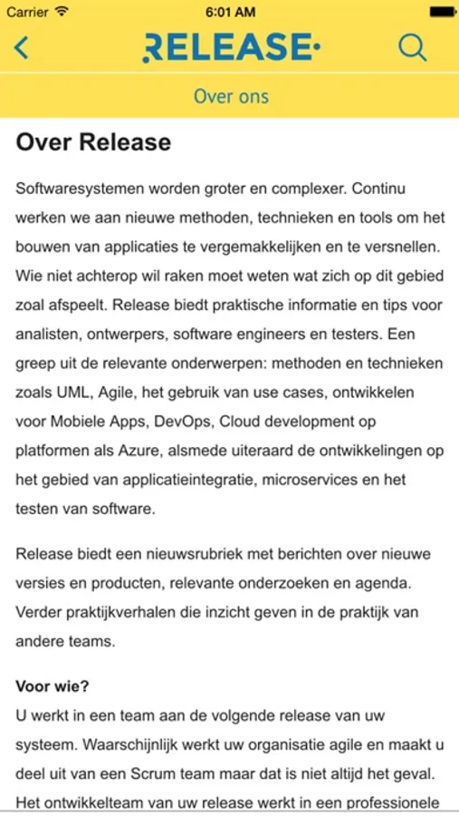 Softwaresystemen worden groter en complexer. Continu werken we aan nieuwe methoden, technieken en tools om het bouwen van applicaties te vergemakkelijken en te versnellen. Wie niet achterop wil raken moet weten wat zich op dit gebied zoal afspeelt. Release biedt praktische informatie en tips voor analisten, ontwerpers, software engineers en testers. Een greep uit de relevante onderwerpen: methoden en technieken zoals UML, Agile, het gebruik van use cases, ontwikkelen voor Mobiele Apps, DevOps, Cloud development op platformen als Azure, alsmede uiteraard de ontwikkelingen op het gebied van applicatieintegratie, microservices en het testen van software. Release biedt een nieuwsrubriek met berichten over nieuwe versies en producten, relevante onderzoeken en agenda. Verder interviews en praktijkverhalen die inzicht geven in de praktijk van andere teams. Met haar eigen Vacature portal brengt Release ook vraag en aanbod op de arbeidsmarkt bij elkaar.