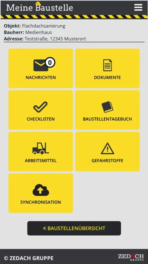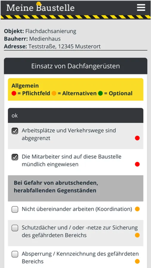 Einhaltung der Arbeitssicherheitsrichtlinien dar. Dazu gibt es artikel- und baustellenbezogene Checklisten,