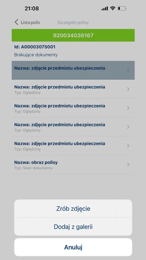 Niewątpliwym plusem aplikacji jest lista polis użytkownika, na której znajdzie on informację o ilości brakujących zdjęć i załączników dla danej polisy.