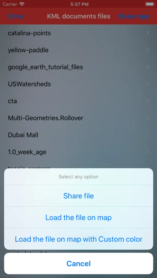 —>Tap on the file in Document folder to Share or export the kml files to another application