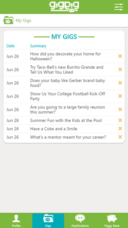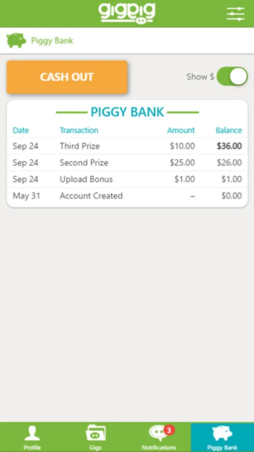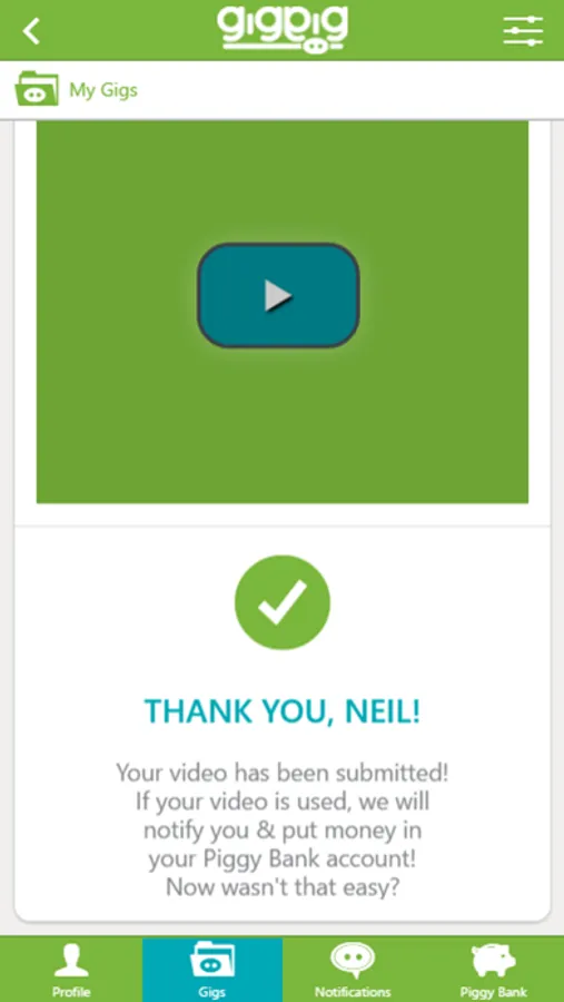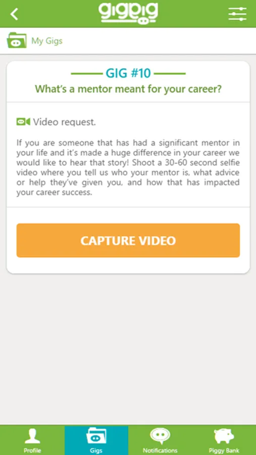 GigPig is an application that allows users to accept and perform specific assignments for photos and videos. Users receive “gigs” and act on them by shooting and uploading customized photo or video content. Our reviewers then take a look at the uploads, and may decide to reward good ones by adding some "pig coins" to the user's GigPig piggy bank. When a user has accrued $10 or more, they have the option to cash out.