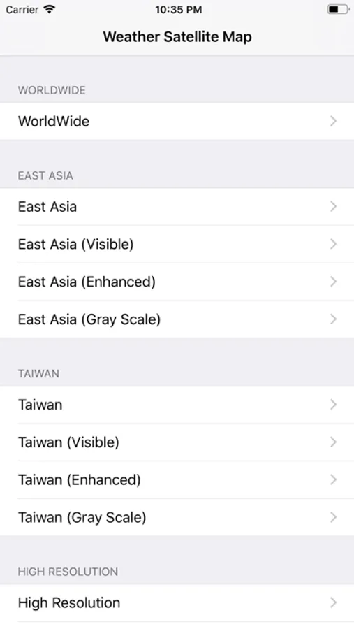 WorldWide, Infrared Black and White- Global, Infrared Color Intensification- Global, Visible- Global, Full Resolution Infrared Black and White- Golbal, East Asia, Taiwan, True color Image, Taiwan (Visible), Taiwan (Enhanced), Taiwan (Gray Scale), High Resolution (Visible), High Resolution (Enhanced), High Resolution (Gray Scale), Radar (Topography Not Displayed (Taiwan Extended Domain)), Radar (Topography Displayed (Taiwan Extended Domain)), Radar (Topography Not Displayed (Taiwan Domain)), Radar (Topography Displayed (Taiwan Domain))