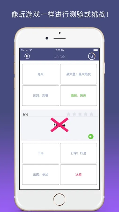 挑战模式,只听单词发音,从8个选项中快速回答,非常刺激,让你的心跳瞬间加速!