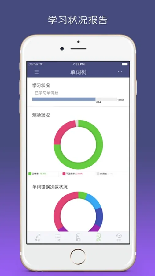 ・已学习单词数:图形展示所有单词及短语的学习进度;