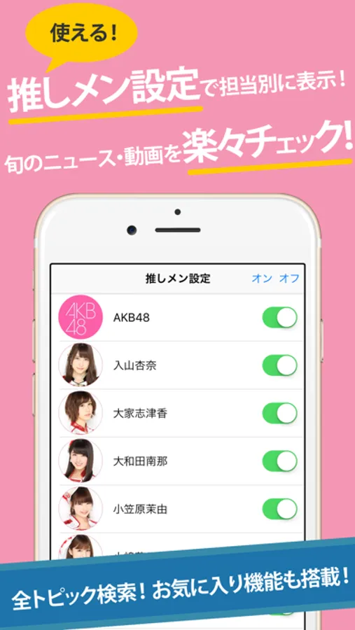 全コンテンツをお好きなメンバー(推しメン)別に表示できます。