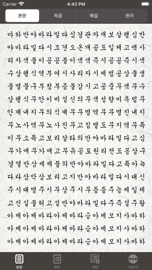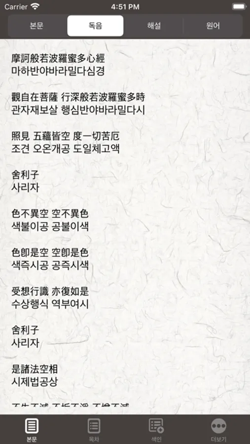 • 독음 : 한자의 음으로 된 반야심경의 본문입니다.