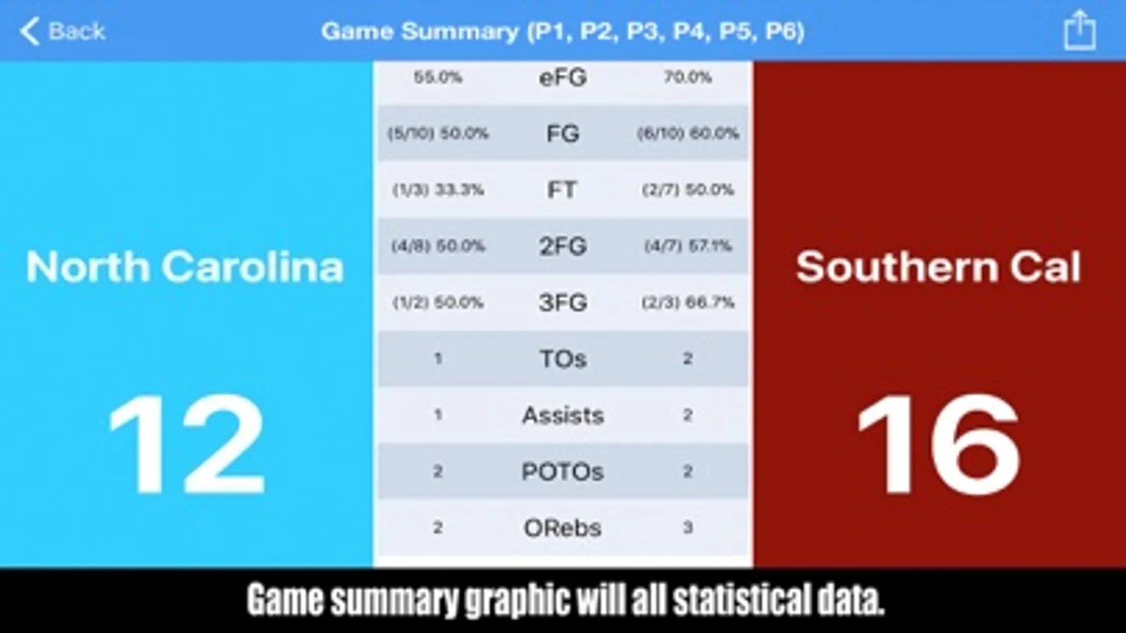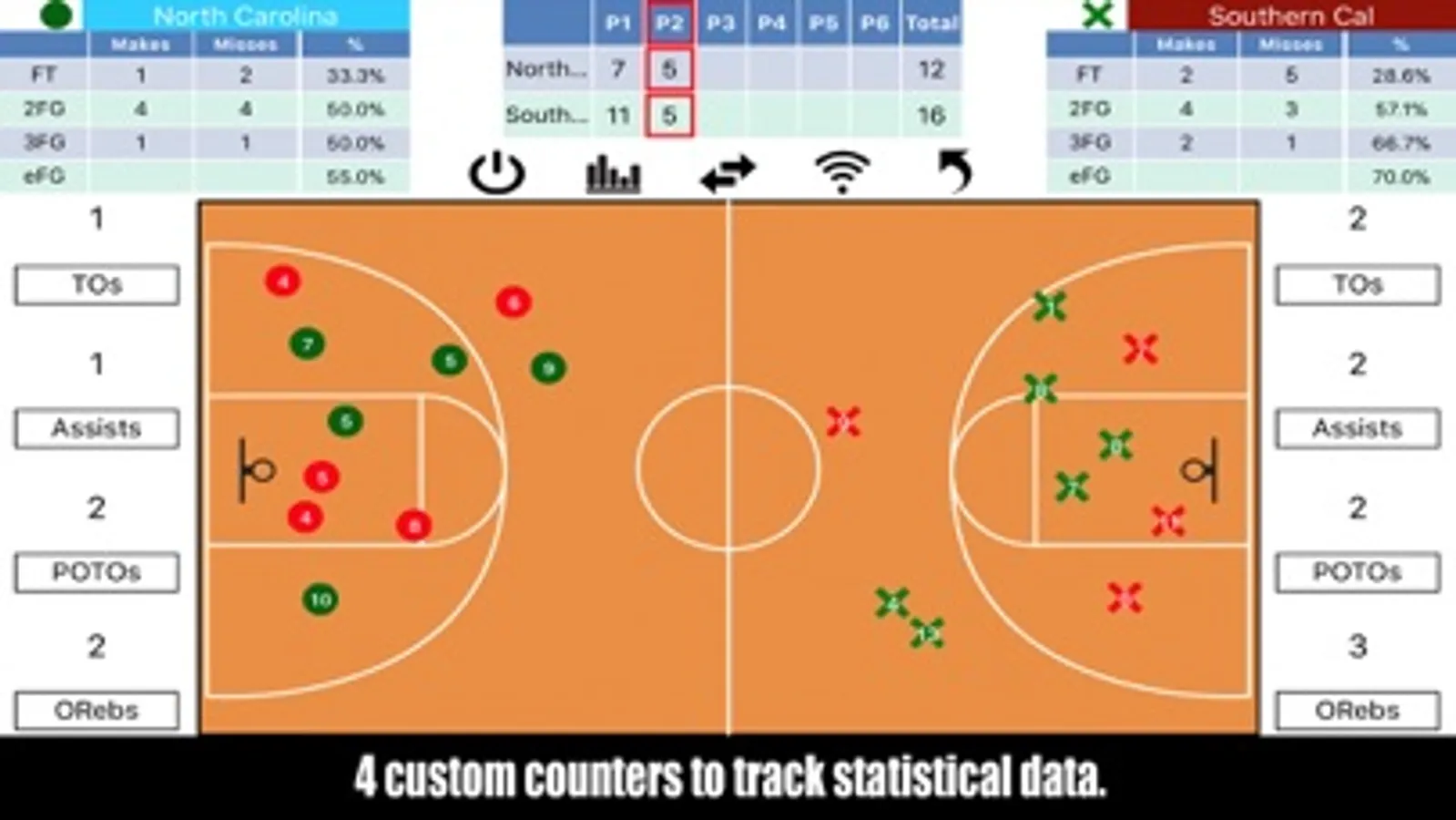 One key feature is the option to track shots by a player's number. Simply enable this option in the config menu and a player's number will be placed on top of the made or missed shot. There are also 4 custom counters to keep track of other important stats like assists, turnovers, points of TOs, fastbreak points, or other key metrics. Don't spend hundreds of dollars on a digital scoreboard, simply use Tap Shots for all your game scoring and statistical needs!